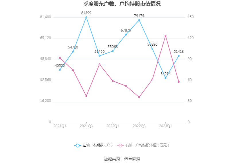 筹码集中度方面,截至2023年二季度末,公司股东总户数为5.14万户,较一季度末增长了1.72万户,增幅50.27%;户均持股市值由一季度末的123.46万元下降至57.59万元,降幅为53.35%。