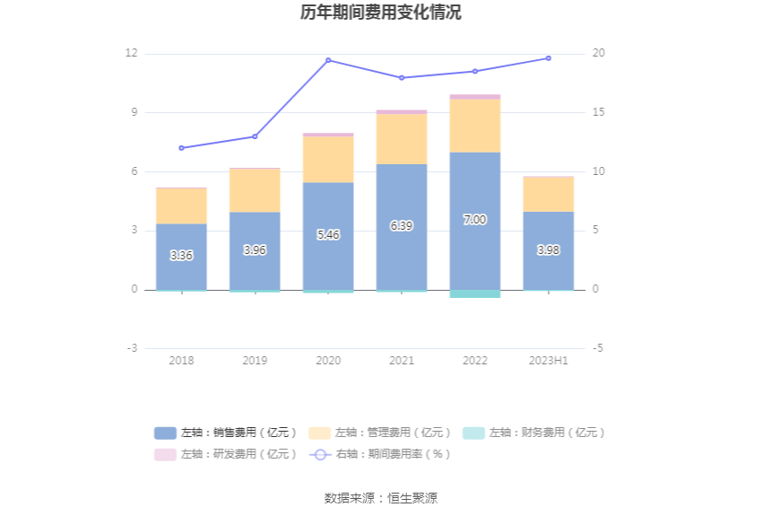 2023年上半年,公司期间费用为5.72亿元,较上年同期增加1.30亿元;期间费用率为19.63%,较上年同期上升0.40个百分点。其中,销售费用同比增长16.33%,管理费用同比增长36.76%,研发费用同比下降52.68%,财务费用由去年同期的-3941.53万元变为-597.29万元。