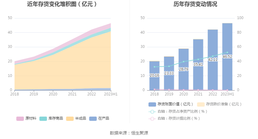 从存货变动来看,截至2023年上半年末,公司存货账面价值为46.52亿元,占净资产的52.55%,较上年末增加4.41亿元。其中,存货跌价准备为1142.16万元,计提比例为0.24%。