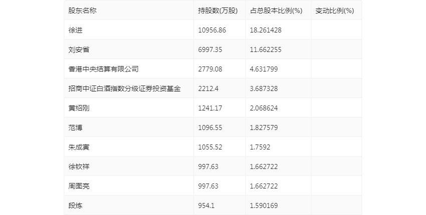 半年报显示,2023年上半年末的公司十大流通股东中,持股最多的为徐进,占比18.26%。十大流通股东名单相比2023年一季报维持不变。在具体持股比例上,香港中央结算有限公司、招商中证白酒指数分级证券投资基金持股有所上升。