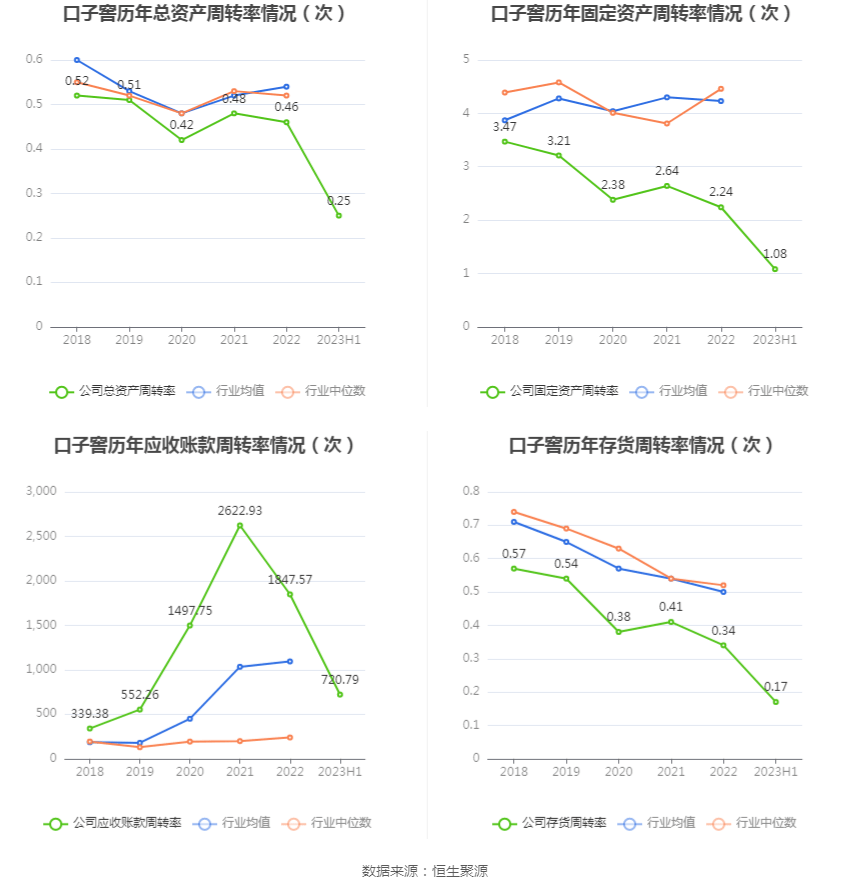 营运能力方面,2023年上半年,公司总资产周转率为0.25次,上年同期为0.22次(2022年上半年行业平均值为0.29次,公司位居同行业17/20);固定资产周转率为1.08次,上年同期为1.11次(2022年上半年行业平均值为2.30次,公司位居同行业15/20);公司应收账款周转率、存货周转率分别为720.79次、0.17次。