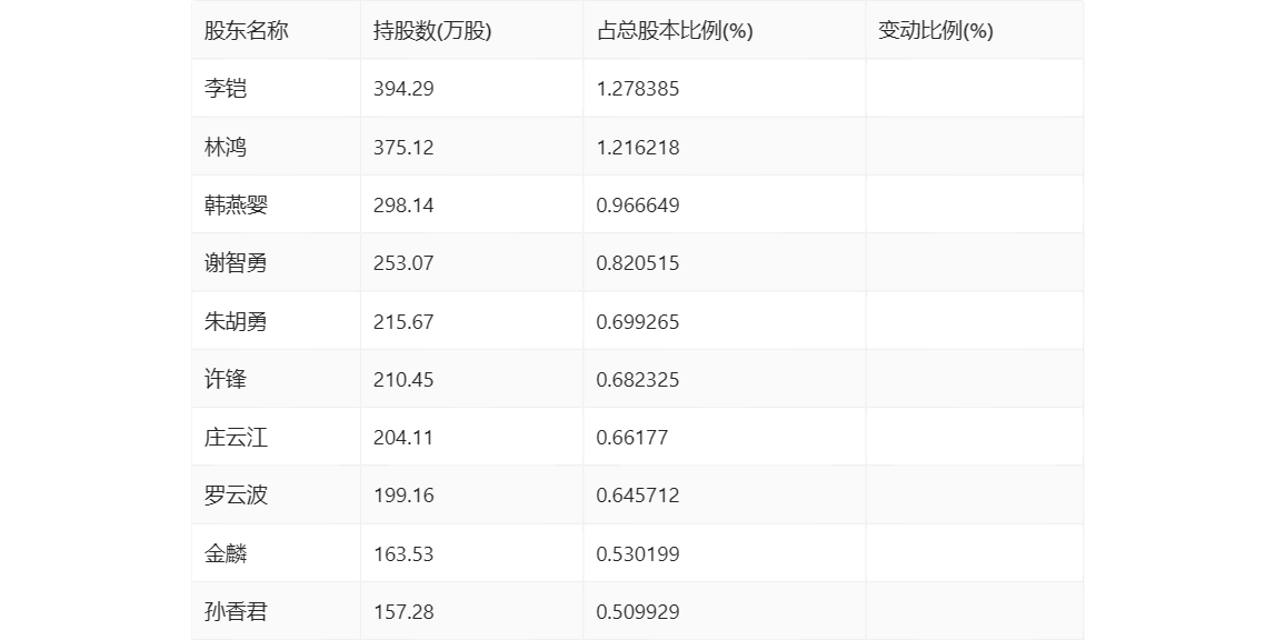 半年报显示,2023年上半年末的公司十大流通股东中,新进股东为孙香君,取代了一季度末的范丽明。在具体持股比例上,许锋持股有所上升,韩燕婴持股有所下降。