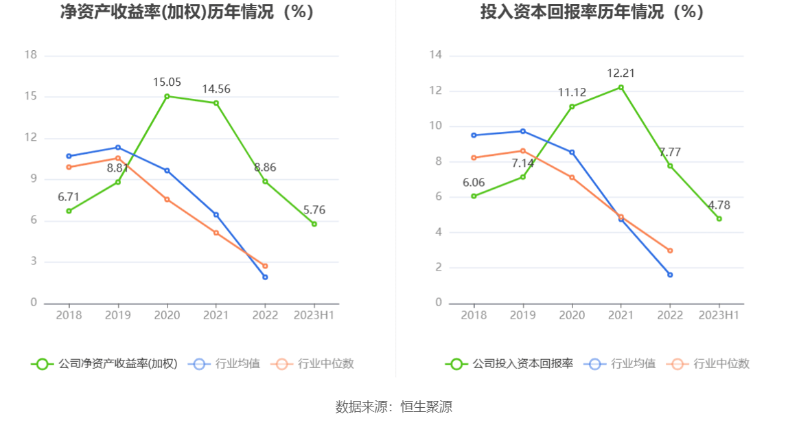 数据显示,2023年上半年公司加权平均净资产收益率为5.76%,较上年同期增长3.64个百分点;公司2023年上半年投入资本回报率为4.78%,较上年同期增长2.86个百分点。