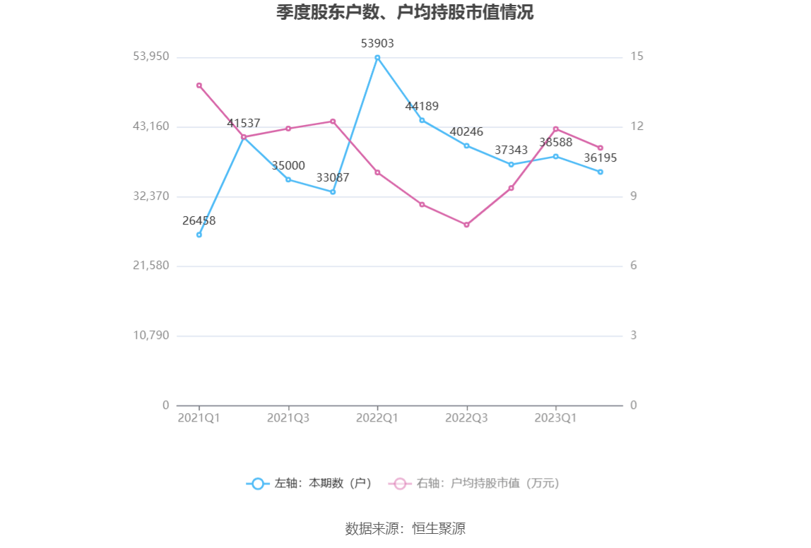 筹码集中度方面,截至2023年二季度末,公司股东总户数为3.62万户,较一季度末下降了2393户,降幅6.20%;户均持股市值由一季度末的11.91万元下降至11.10万元,降幅为6.80%。