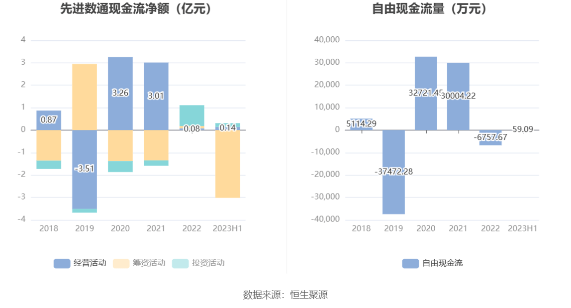 进一步统计发现,2023年上半年公司自由现金流为59.09万元,上年同期为-58712.57万元。