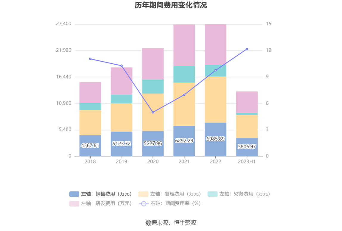 2023年上半年,公司期间费用为1.34亿元,较上年同期增加1369.43万元;期间费用率为12.17%,较上年同期上升0.24个百分点。其中,销售费用同比增长25.47%,管理费用同比增长5.54%,研发费用同比增长23.41%,财务费用同比下降52.02%。