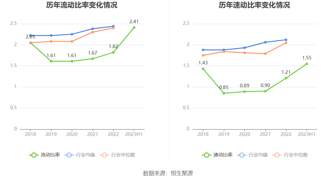 2023年上半年,公司流动比率为2.41,速动比率为1.55。