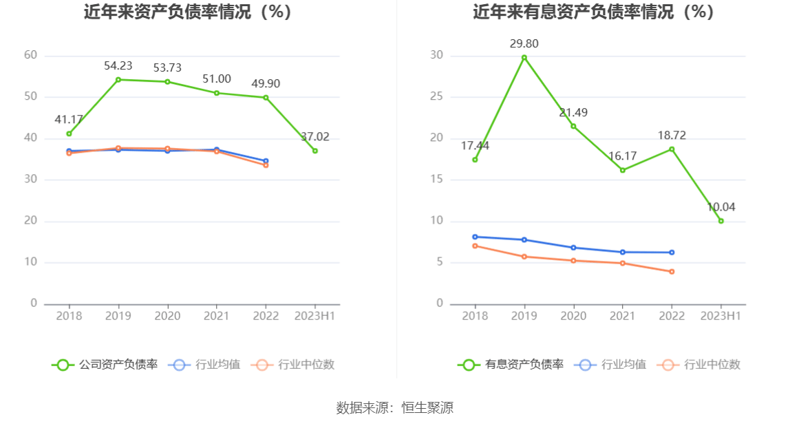 偿债能力方面,公司2023年二季度末资产负债率为37.02%,相比上年末减少12.88个百分点;有息资产负债率为10.04%,相比上年末减少8.68个百分点。