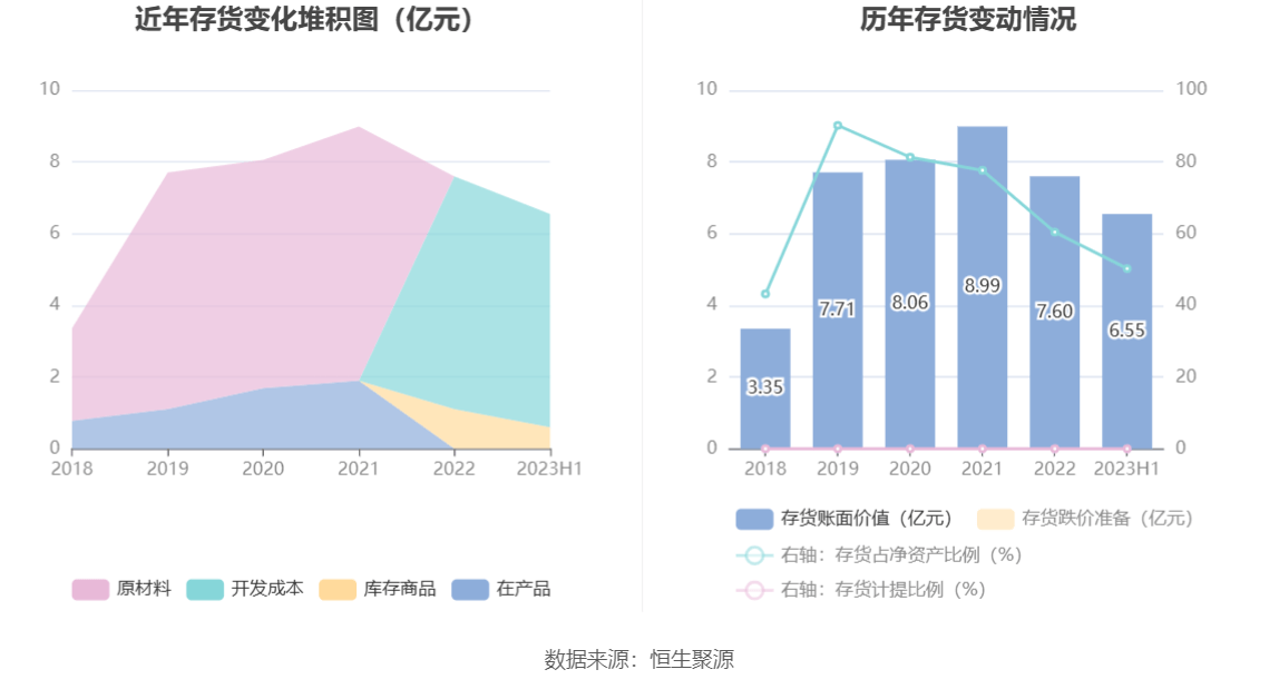 从存货变动来看,截至2023年上半年末,公司存货账面价值为6.55亿元,占净资产的50.25%。根据财报,公司本期没有计提存货跌价准备。