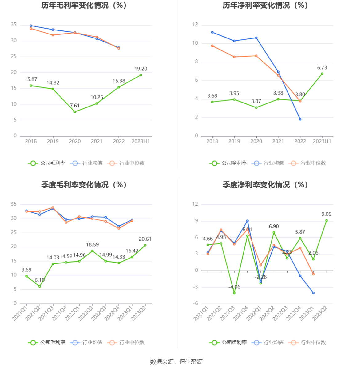 2023年上半年,公司毛利率为19.20%,同比上升2.37个百分点;净利率为6.73%,较上年同期上升4.28个百分点。从单季度指标来看,2023年第二季度公司毛利率为20.61%,同比上升2.02个百分点,环比上升4.19个百分点;净利率为9.09%,较上年同期上升2.19个百分点,较上一季度上升7.03个百分点。
