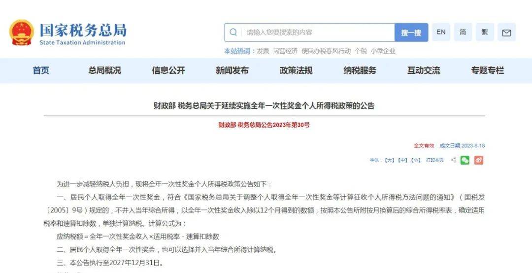 关于延续实施全年一次性奖金个人所得税政策的公告