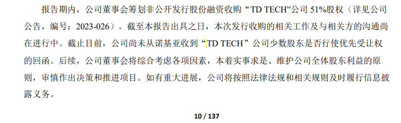 8月18日,东方材料发布的半年报显示,“TD TECH”公司51%股权发行收购的相关工作及与相关方的沟通尚在进行中。截至报告出具日,公司尚未从诺基亚收到该公司少数股东是否行使优先受让权的回函。