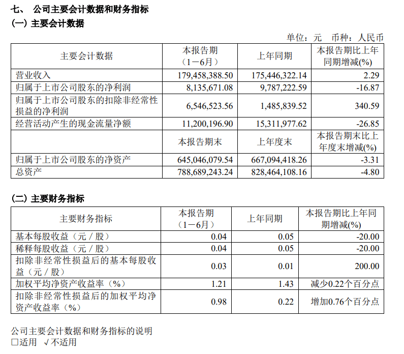 2023年上半年,公司营业收入为1.79亿元,同比上涨2.29%;扣非净利润为0.06亿元,同比上涨340.59%,似乎出现了一定改善。但实际上,该盈利数字尚未超过2021年的0.12亿元,更与2020年的0.24亿元相去甚远。