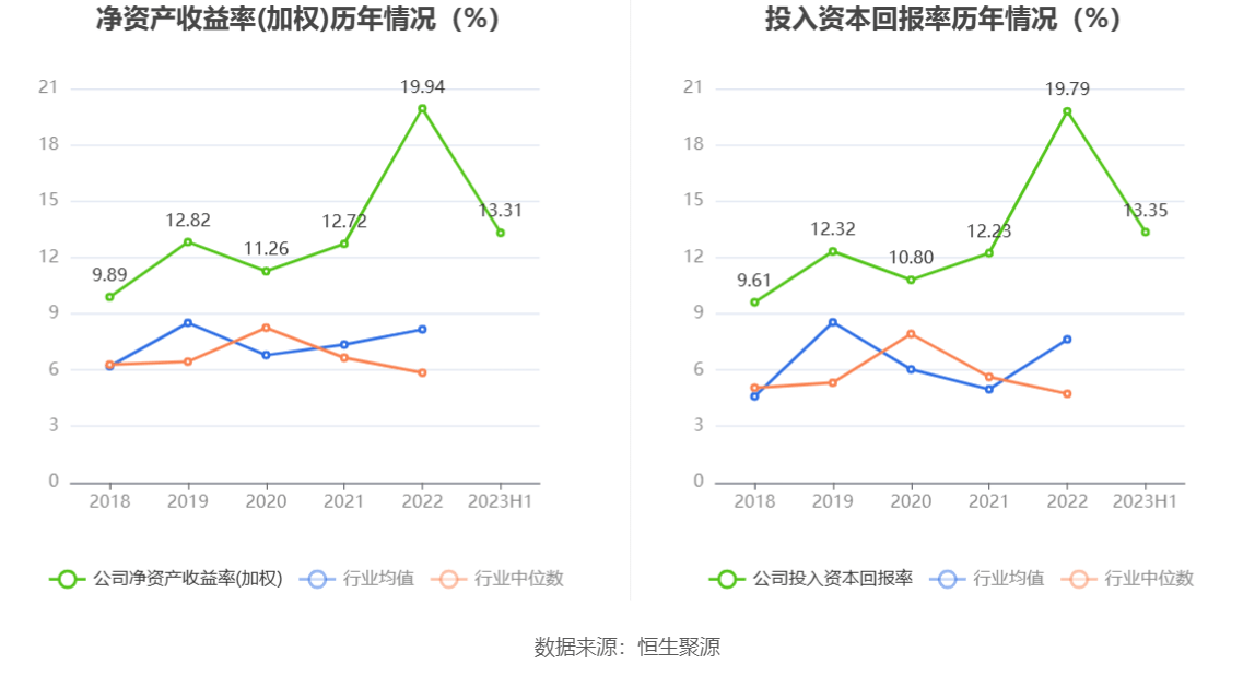 数据显示,2023年上半年公司加权平均净资产收益率为13.31%,较上年同期增长6.38个百分点;公司2023年上半年投入资本回报率为13.35%,较上年同期增长6.51个百分点。