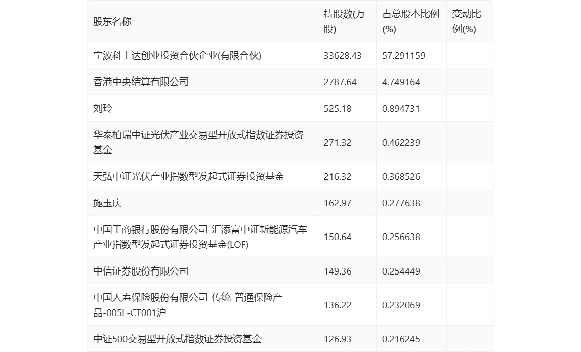 半年报显示,2023年上半年末的公司十大流通股东中,新进股东为天弘中证光伏产业指数型发起式证券投资基金、施玉庆、中国工商银行股份有限公司-汇添富中证新能源汽车产业指数型发起式证券投资基金(LOF)、中信证券股份有限公司、中国人寿保险股份有限公司-传统-普通保险产品-005L-CT001沪、中证500交易型开放式指数证券投资基金,取代了一季度末的俞慧军、泰达宏利转型机遇股票型证券投资基金、东方阿尔法优势产业混合型发起式证券投资基金、汇添富盈鑫灵活配置混合型证券投资基金、南方成长先锋混合型证券投资基金、兴全趋势投资混合型证券投资基金。在具体持股比例上,香港中央结算有限公司持股有所上升,宁波科士达创业投资合伙企业(有限合伙)、刘玲、华泰柏瑞中证光伏产业交易型开放式指数证券投资基金持股有所下降。