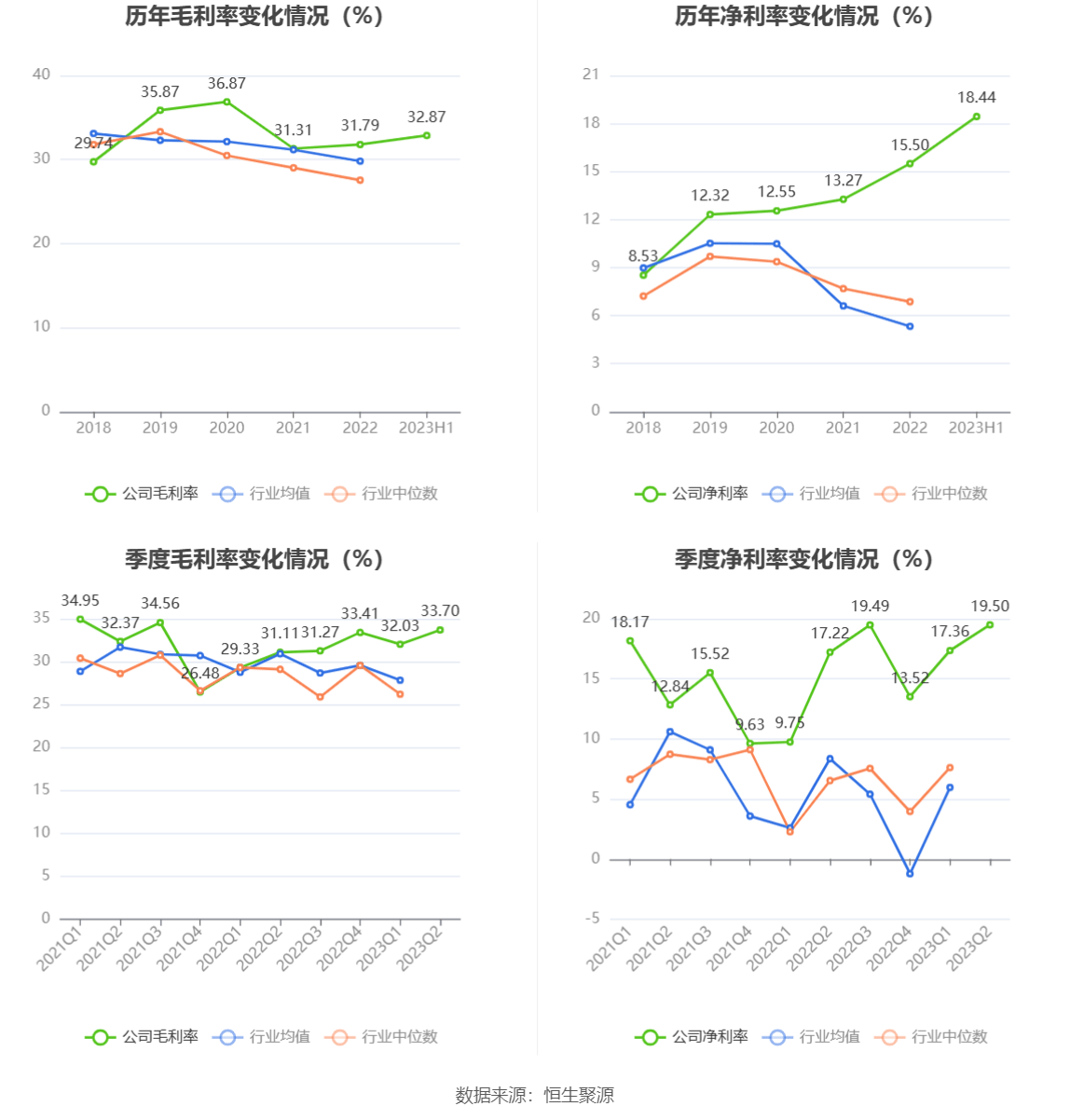 2023年上半年,公司毛利率为32.87%,同比上升2.42个百分点;净利率为18.44%,较上年同期上升3.97个百分点。从单季度指标来看,2023年第二季度公司毛利率为33.70%,同比上升2.59个百分点,环比上升1.67个百分点;净利率为19.50%,较上年同期上升2.28个百分点,较上一季度上升2.14个百分点。