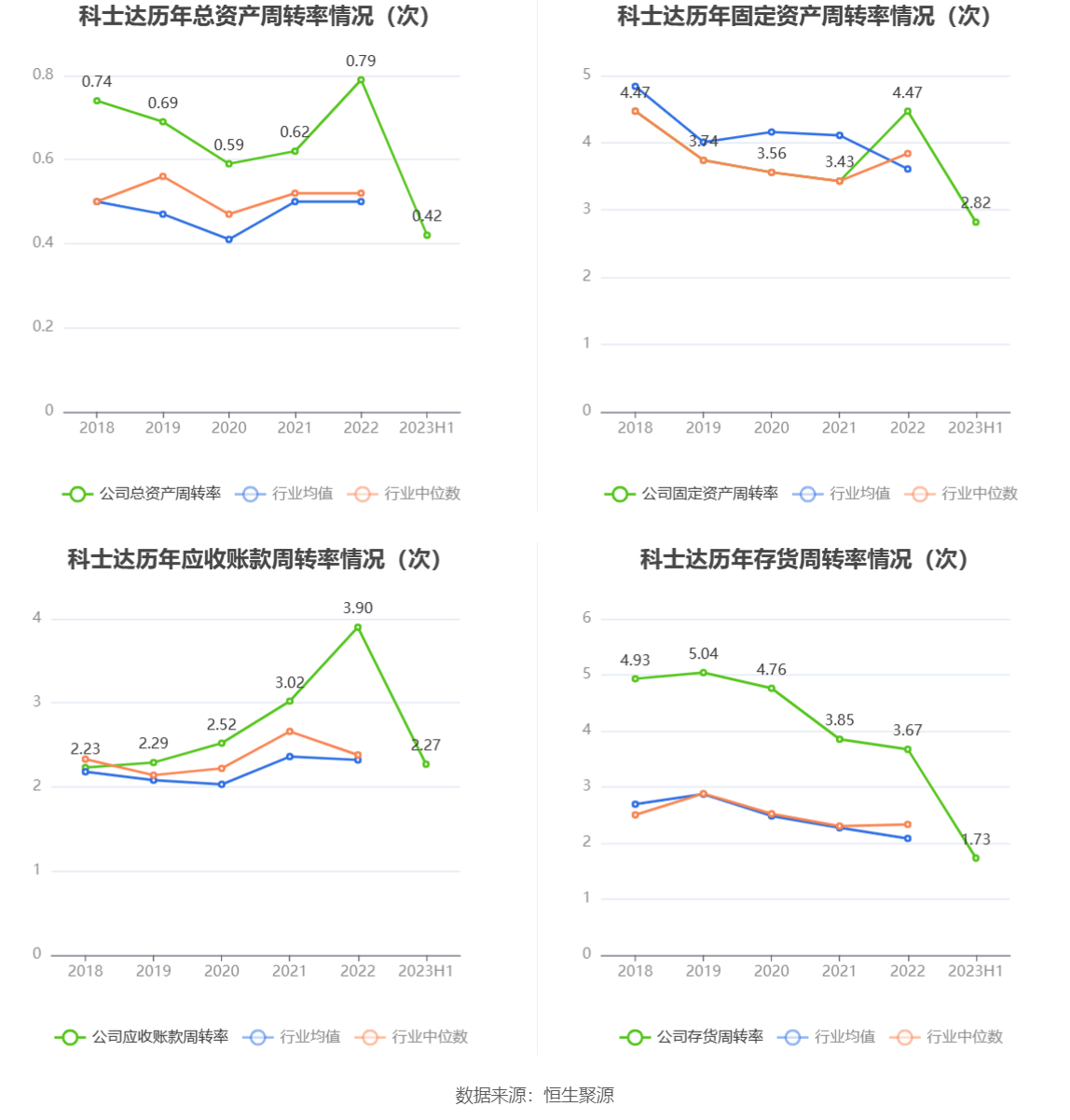 营运能力方面,2023年上半年,公司总资产周转率为0.42次,上年同期为0.30次(2022年上半年行业平均值为0.23次,公司位居同行业7/21);固定资产周转率为2.82次,上年同期为1.57次(2022年上半年行业平均值为1.80次,公司位居同行业11/21);公司应收账款周转率、存货周转率分别为2.27次、1.73次。