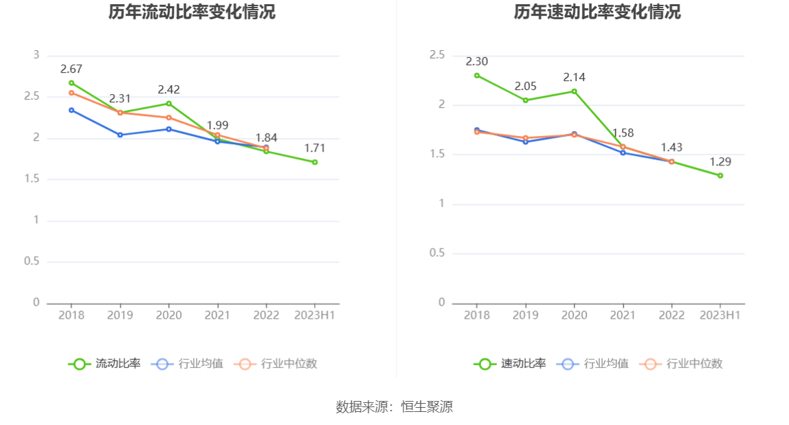 2023年上半年,公司流动比率为1.71,速动比率为1.29。