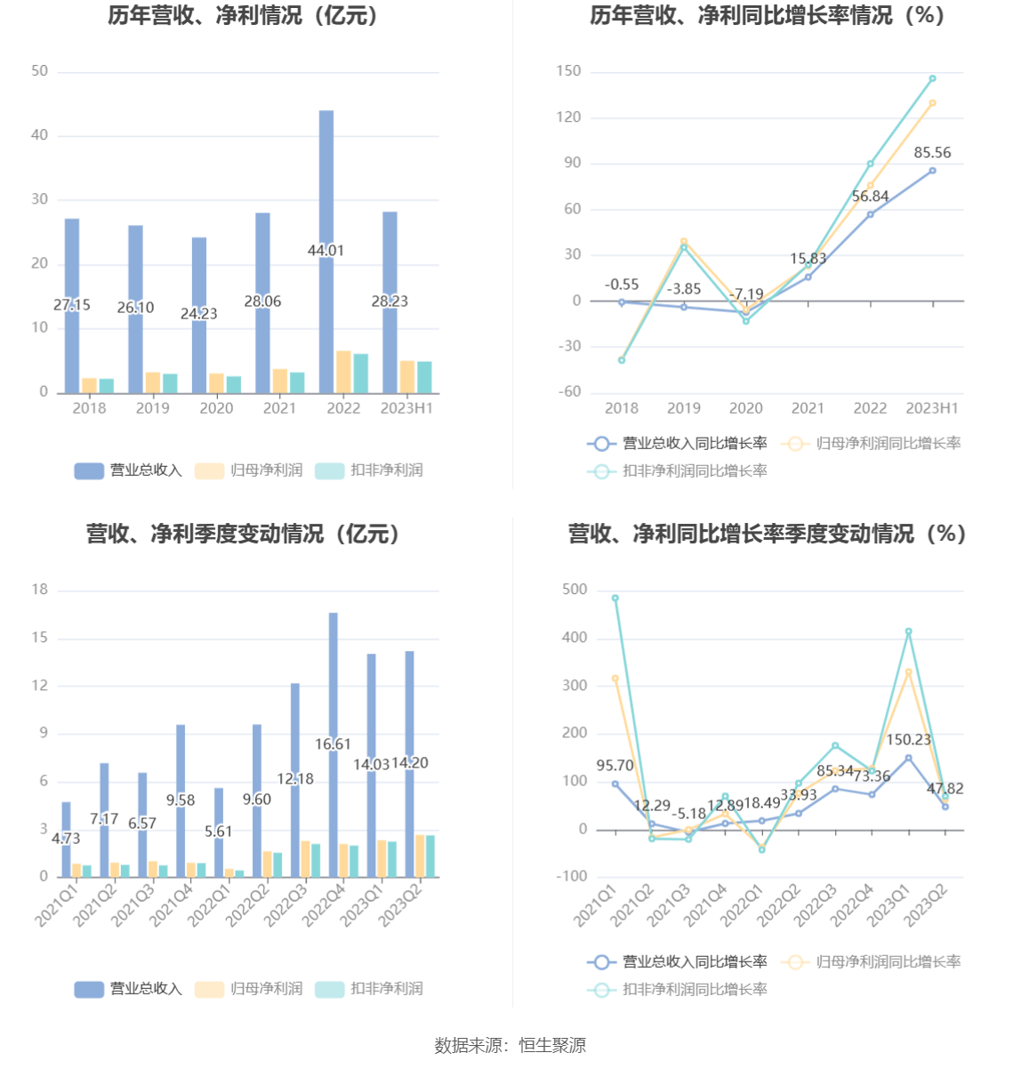 根据半年报,公司第二季度实现营业总收入14.2亿元,同比增长47.82%,环比增长1.22%;归母净利润2.67亿元,同比增长63.35%,环比增长14.46%;扣非净利润2.64亿元,同比增长70.02%,环比增长17.08%。