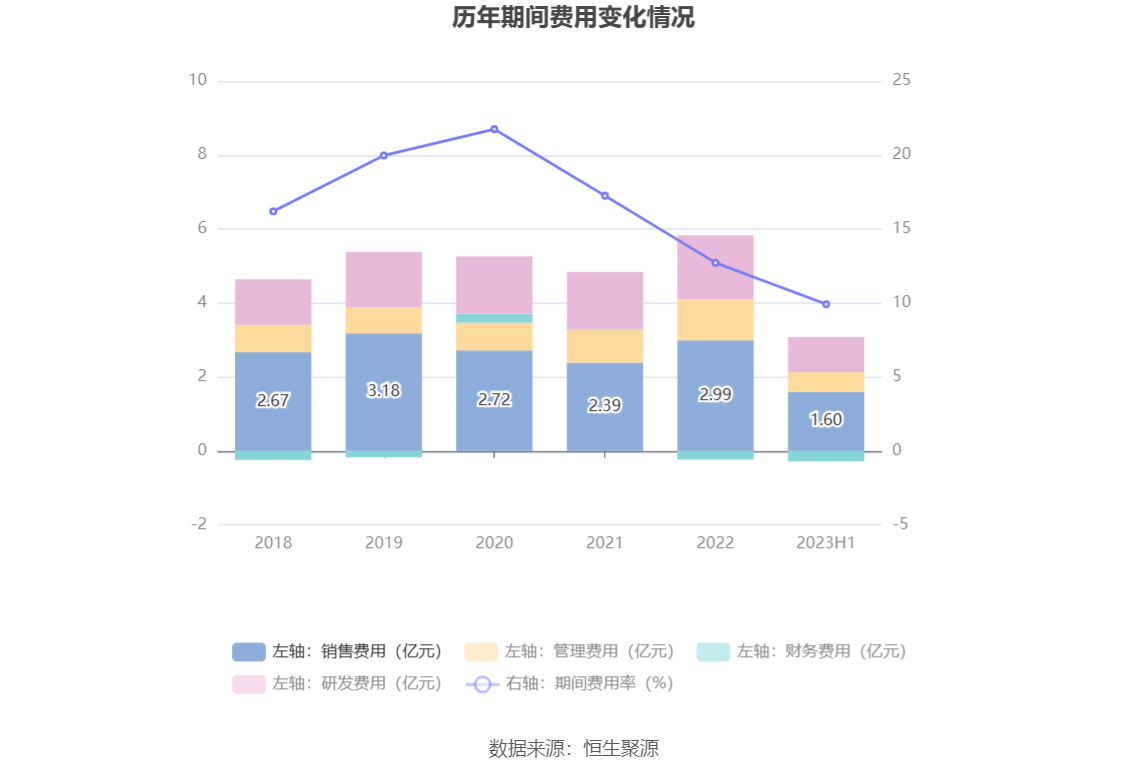 2023年上半年,公司期间费用为2.80亿元,较上年同期增加7313.09万元;但期间费用率为9.92%,较上年同期下降3.67个百分点。其中,销售费用同比增长50.35%,管理费用同比增长14.45%,研发费用同比增长47.35%,财务费用由去年同期的-1012.85万元变为-2775.56万元。
