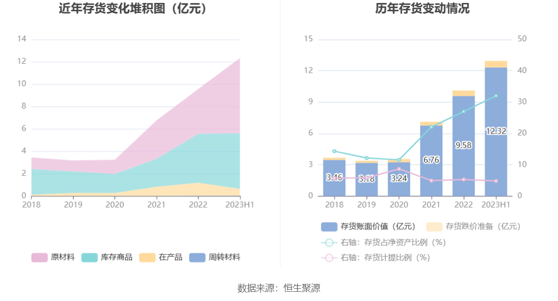 从存货变动来看,截至2023年上半年末,公司存货账面价值为12.32亿元,占净资产的32.01%,较上年末增加2.75亿元。其中,存货跌价准备为6258.28万元,计提比例为4.83%。