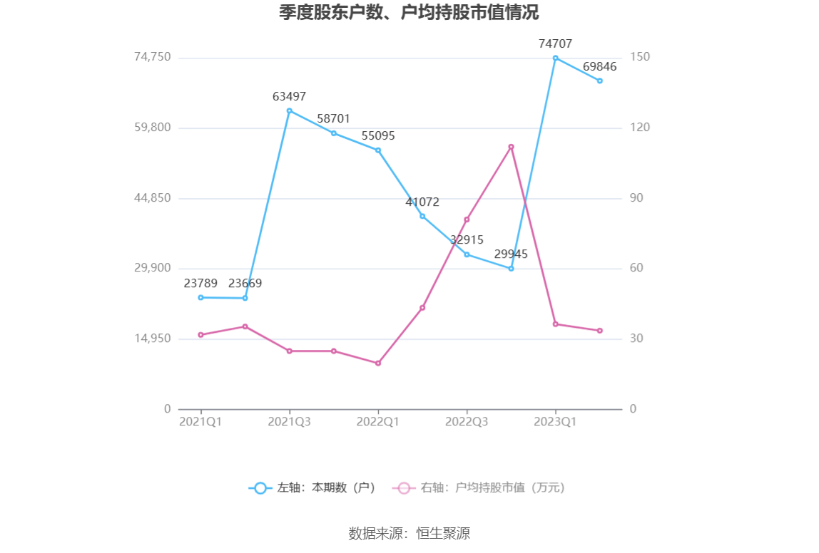 筹码集中度方面,截至2023年二季度末,公司股东总户数为6.98万户,较一季度末下降了4861户,降幅6.51%;户均持股市值由一季度末的36.41万元下降至33.62万元,降幅为7.66%。