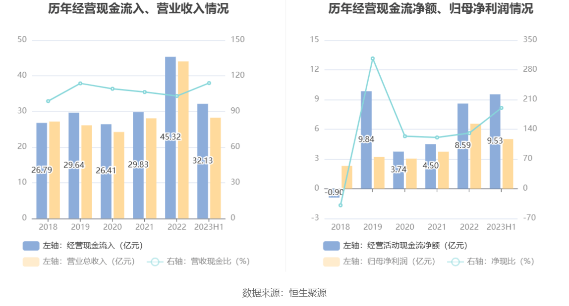 2023年上半年,公司营业收入现金比为113.83%,净现比为190.22%。