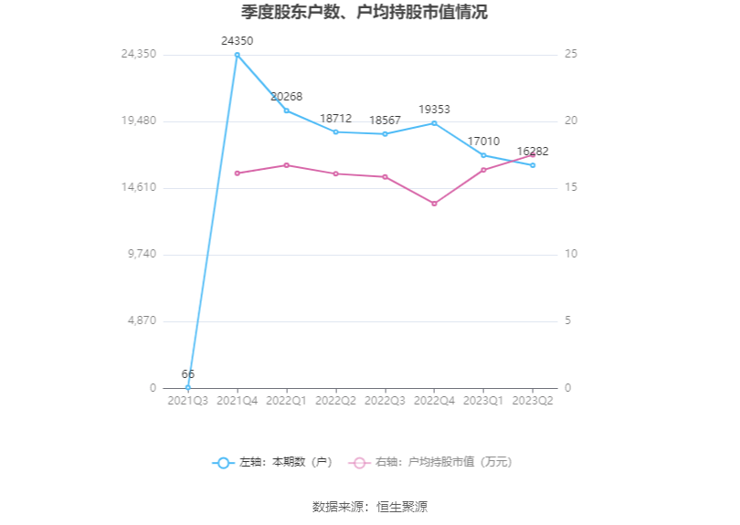 筹码集中度方面,截至2023年二季度末,公司股东总户数为1.63万户,较一季度末下降了728户,降幅4.28%;户均持股市值由一季度末的16.37万元上升至17.50万元,增幅为6.90%。