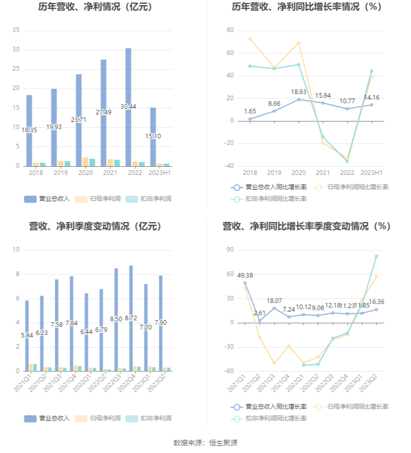 根据半年报,公司第二季度实现营业总收入7.9亿元,同比增长16.36%,环比增长9.78%;归母净利润3182.54万元,同比增长57.24%,环比下降17.67%;扣非净利润2974.93万元,同比增长82.39%,环比下降12.19%。