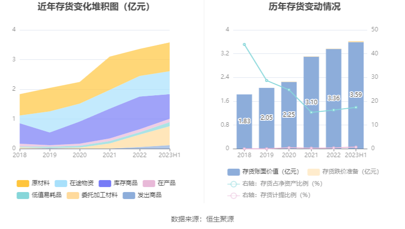 从存货变动来看,截至2023年上半年末,公司存货账面价值为3.59亿元,占净资产的17.44%,较上年末增加2273.58万元。其中,存货跌价准备为256.05万元,计提比例为0.71%。