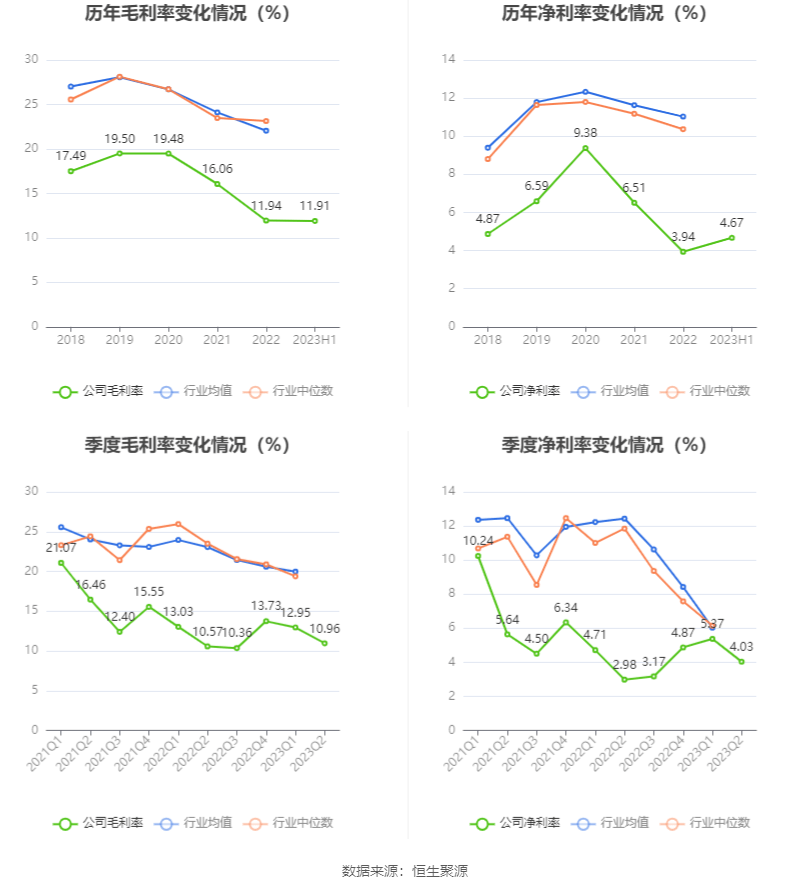 2023年上半年,公司毛利率为11.91%,同比上升0.14个百分点;净利率为4.67%,较上年同期上升0.85个百分点。从单季度指标来看,2023年第二季度公司毛利率为10.96%,同比上升0.39个百分点,环比下降1.99个百分点;净利率为4.03%,较上年同期上升1.05个百分点,较上一季度下降1.34个百分点。