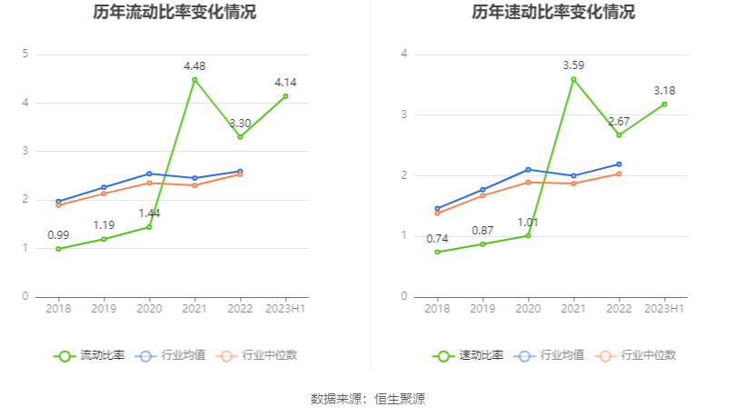 2023年上半年,公司流动比率为4.14,速动比率为3.18。