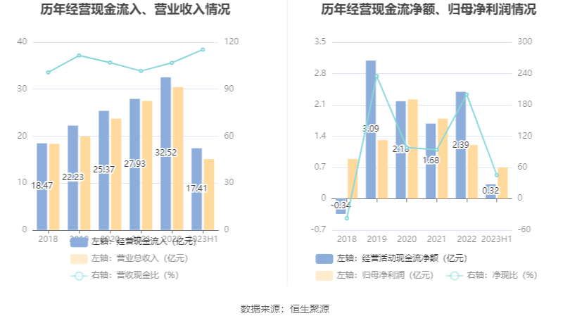 2023年上半年,公司营业收入现金比为115.31%,净现比为45.30%。