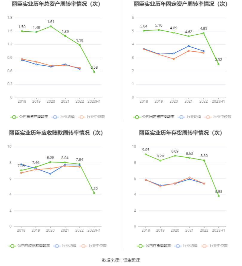 营运能力方面,2023年上半年,公司总资产周转率为0.58次,上年同期为0.53次(2022年上半年行业平均值为0.34次,公司位居同行业11/71);固定资产周转率为2.52次,上年同期为2.07次(2022年上半年行业平均值为2.06次,公司位居同行业30/71);公司应收账款周转率、存货周转率分别为4.20次、3.83次。