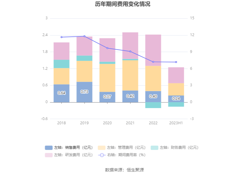 2023年上半年,公司期间费用为1.09亿元,较上年同期增加926.56万元;但期间费用率为7.19%,较上年同期下降0.32个百分点。其中,销售费用同比增长32.93%,管理费用同比增长7.02%,研发费用同比增长11.17%,财务费用由去年同期的-1113.13万元变为-1644.78万元。