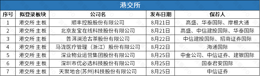 8月21日-8月27日,港交所有7家公司递交主板上市申请。