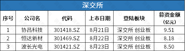 8月21日-8月27日,上交所主板有1家公司上市,科创板有1家公司上市;深交所创业板有3家公司上市。