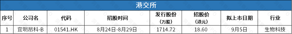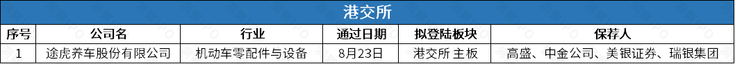 8月21日-8月27日,港交所有1家公司通过聆讯。