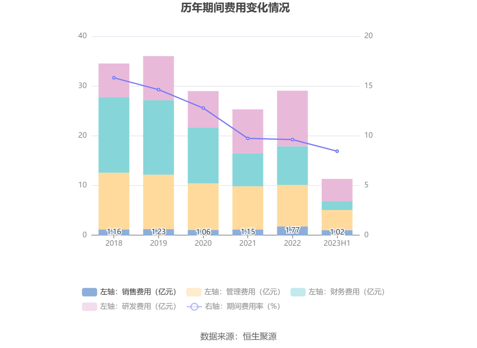 2023年上半年,公司期间费用为11.33亿元,较上年同期增加6841.44万元;但期间费用率为8.45%,较上年同期下降0.07个百分点。其中,销售费用同比增长30.01%,管理费用同比下降0.9%,研发费用同比增长11.8%,财务费用同比增长0.71%。