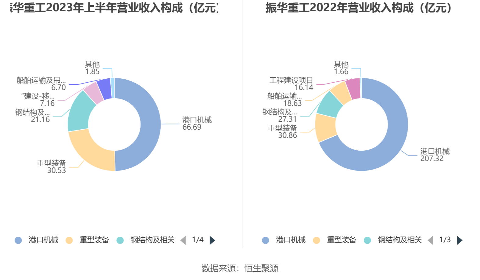 分产品来看,2023年上半年公司主营业务中,港口机械收入66.69亿元,同比下降19.72%,占营业收入的49.74%;重型装备收入30.53亿元,同比增长282.38%,占营业收入的22.77%;钢结构及相关收入收入21.16亿元,同比增长40.36%,占营业收入的15.78%。