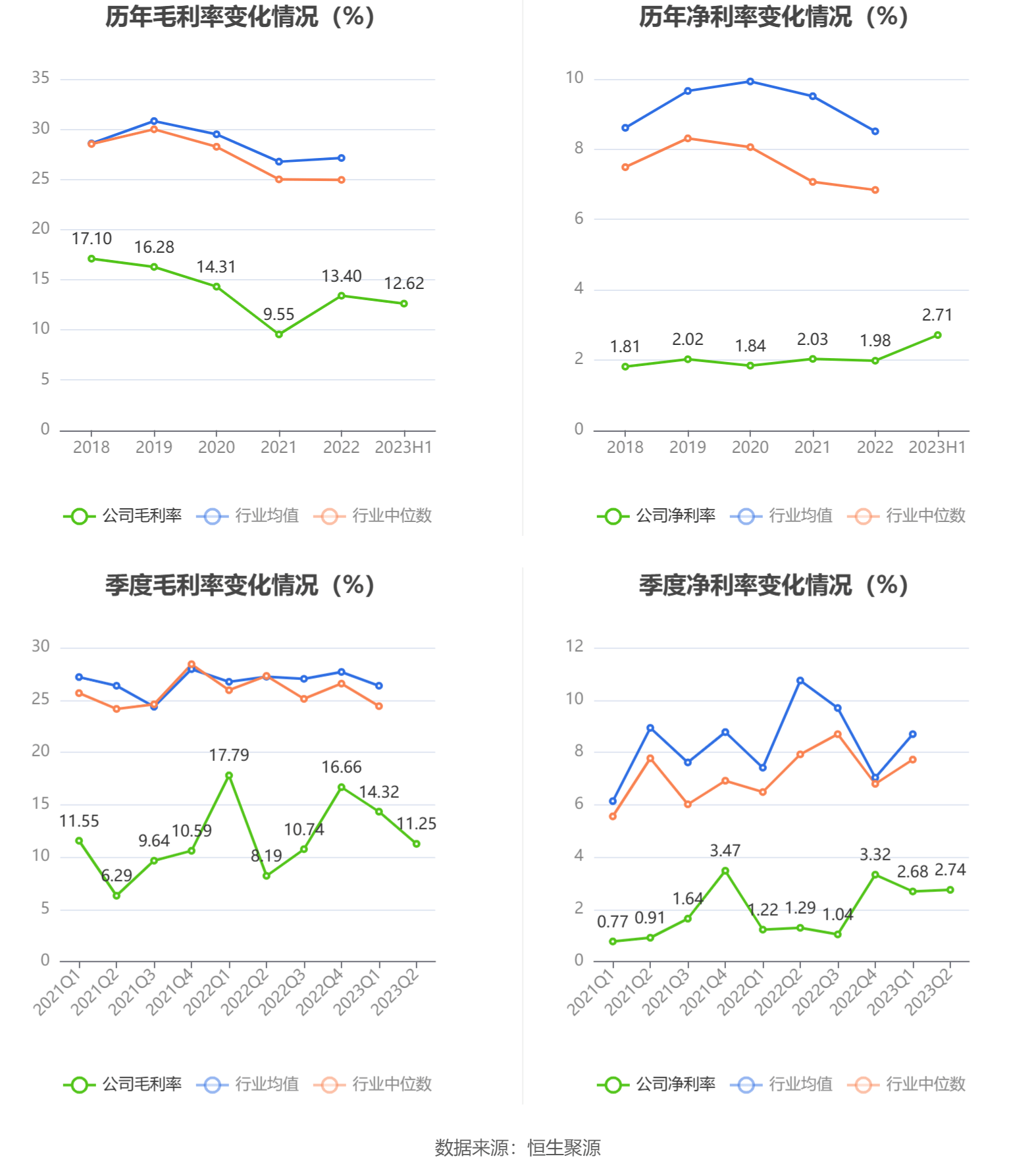 2023年上半年,公司毛利率为12.62%,同比上升0.77个百分点;净利率为2.71%,较上年同期上升1.44个百分点。从单季度指标来看,2023年第二季度公司毛利率为11.25%,同比上升3.06个百分点,环比下降3.07个百分点;净利率为2.74%,较上年同期上升1.45个百分点,较上一季度上升0.06个百分点。