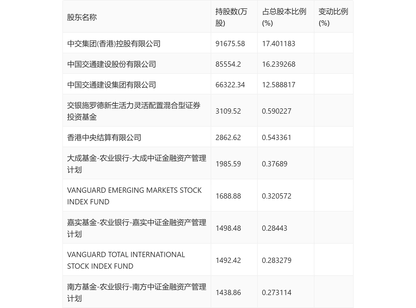 半年报显示,2023年上半年末的公司十大流通股东中,新进股东为香港中央结算有限公司、VANGUARD EMERGING MARKETS STOCK INDEX FUND、嘉实基金-农业银行-嘉实中证金融资产管理计划、VANGUARD TOTAL INTERNATIONAL STOCK INDEX FUND。在具体持股比例上,交银施罗德新生活力灵活配置混合型证券投资基金持股有所上升,南方基金-农业银行-南方中证金融资产管理计划持股有所下降。