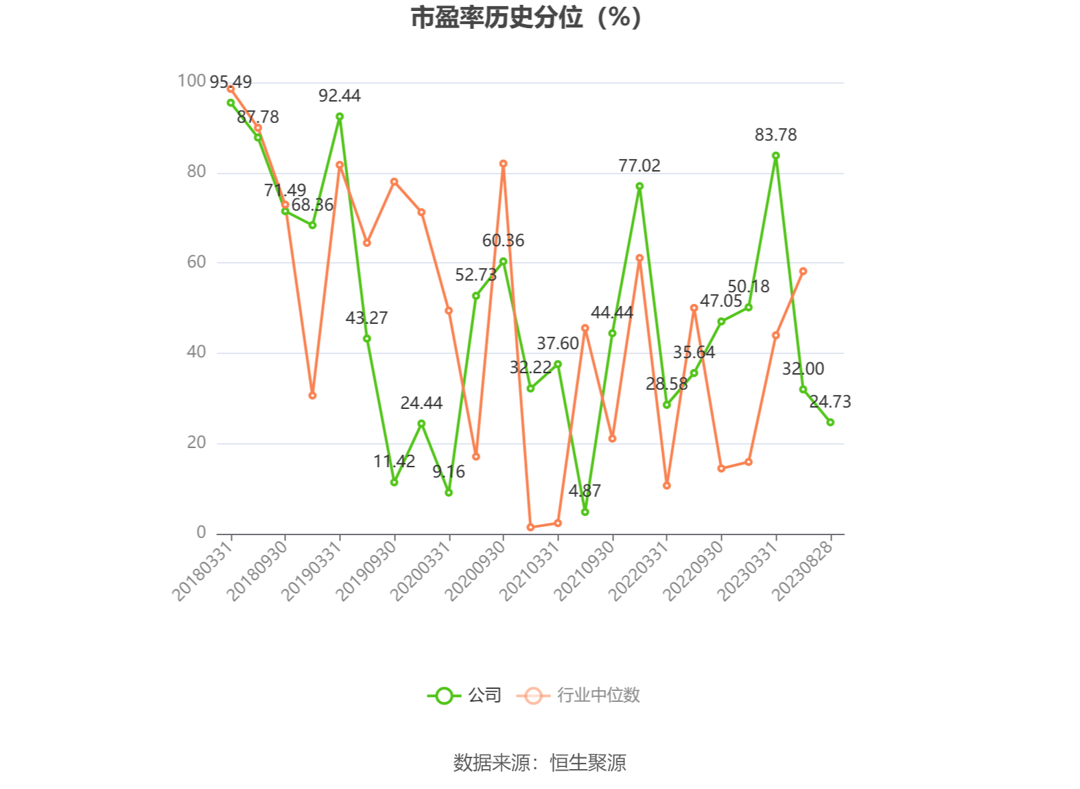 市盈率为负时,不显示当期分位数,会导致折线图中断。