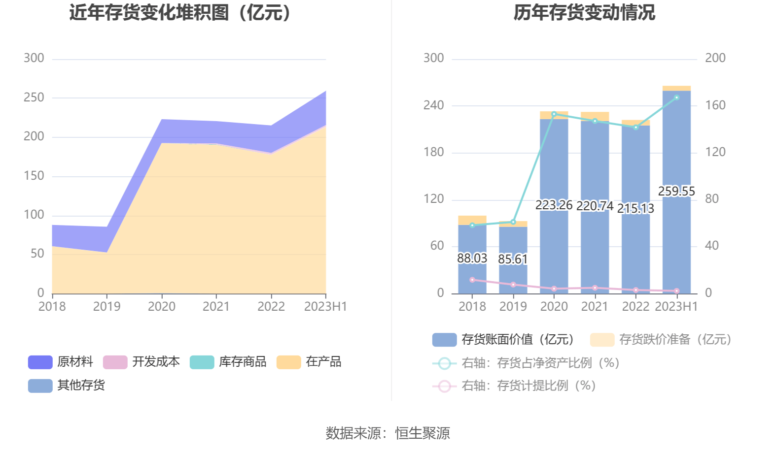 从存货变动来看,截至2023年上半年末,公司存货账面价值为259.55亿元,占净资产的167.3%,较上年末增加44.41亿元。其中,存货跌价准备为6.29亿元,计提比例为2.37%。