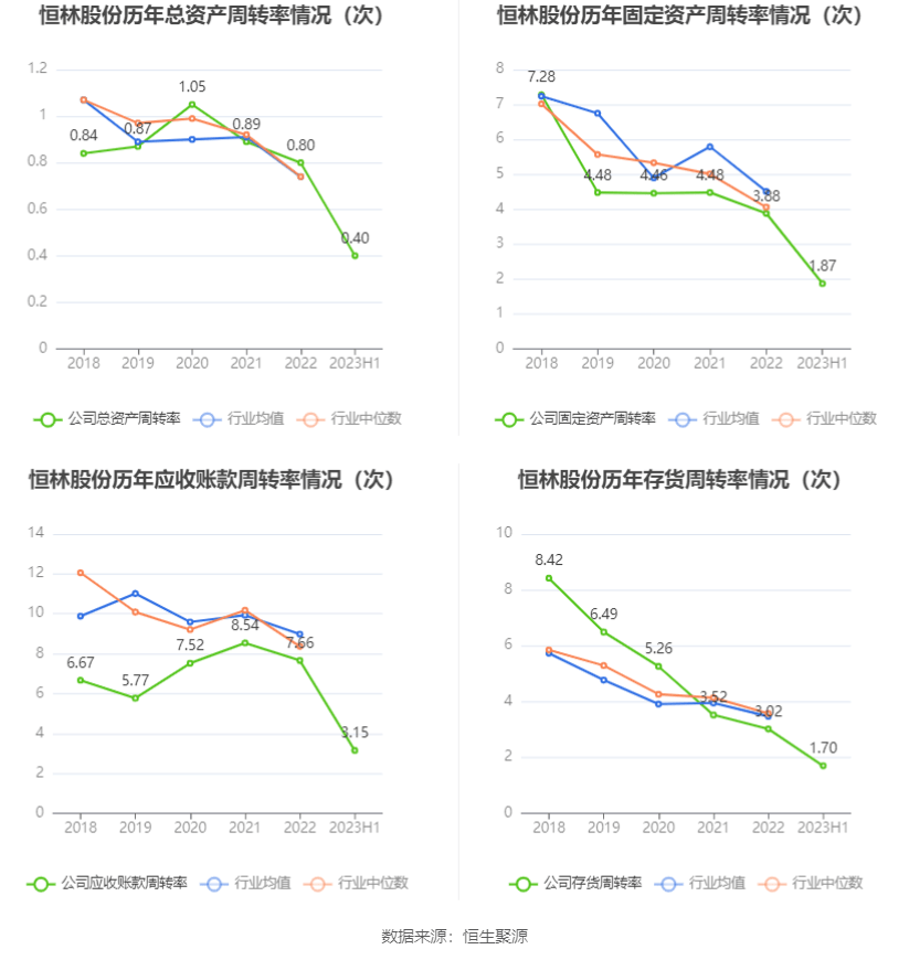 营运能力方面,2023年上半年,公司总资产周转率为0.40次,上年同期为0.38次(2022年上半年行业平均值为0.39次,公司位居同行业8/16);固定资产周转率为1.87次,上年同期为2.01次(2022年上半年行业平均值为2.80次,公司位居同行业9/16);公司应收账款周转率、存货周转率分别为3.15次、1.70次。