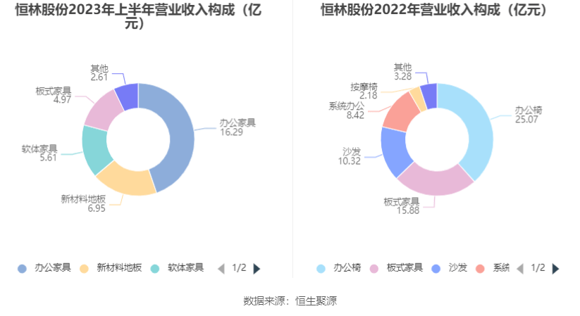 分产品看,办公家具、新材料地板、软体家具2023年上半年毛利率分别为26.36%、21.67%、23.94%。