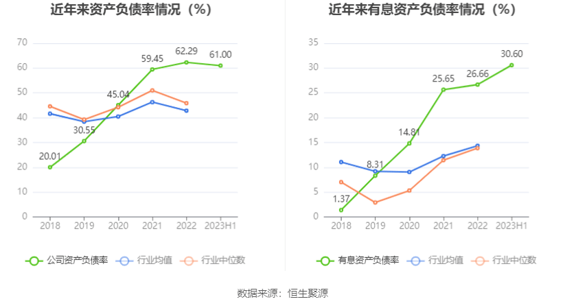 偿债能力方面,公司2023年二季度末资产负债率为61.00%,相比上年末减少1.29个百分点;有息资产负债率为30.60%,相比上年末增加3.94个百分点。