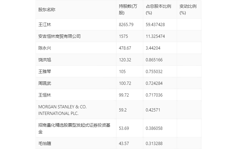 半年报显示,2023年上半年末的公司十大流通股东中,新进股东为MORGAN STANLEY & CO. INTERNATIONAL PLC.、招商量化精选股票型发起式证券投资基金、毛怡暄,取代了一季度末的沈江亭、邓承斌、张龙。在具体持股比例上,王恒林持股有所上升,陈永兴持股有所下降。