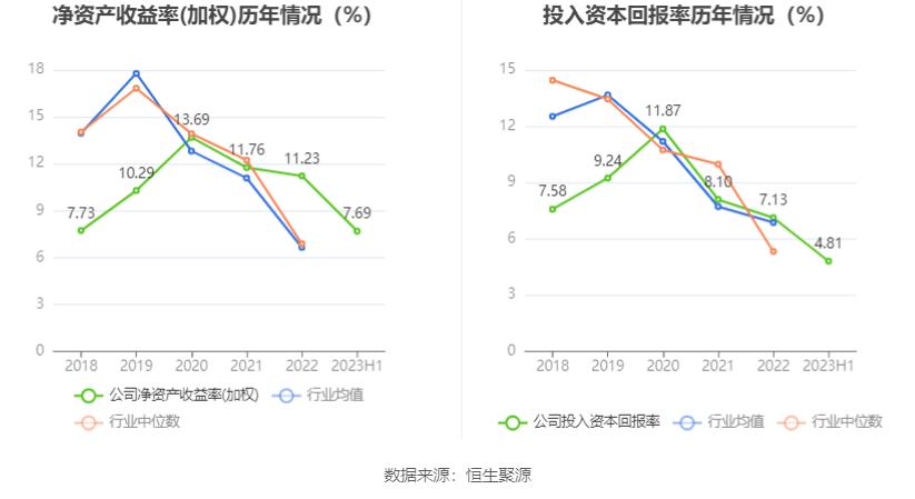 盈利能力方面, 2023年半年度公司加权平均净资产收益率为7.69%,同比上升0.91个百分点。公司2023年半年度投入资本回报率为4.81%,较上年同期上升0.47个百分点。
