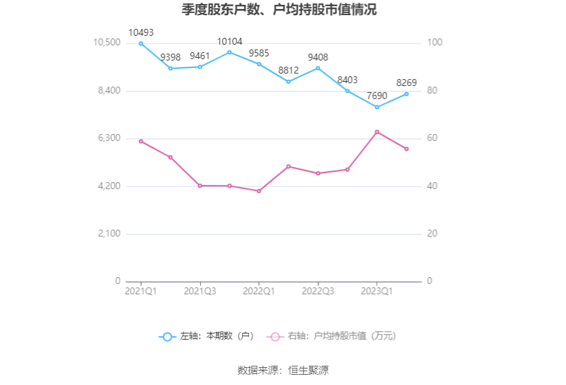 筹码集中度方面,截至2023年二季度末,公司股东总户数为8269户,较一季度末增长了579户,增幅7.53%;户均持股市值由一季度末的62.88万元下降至55.77万元,降幅为11.31%。